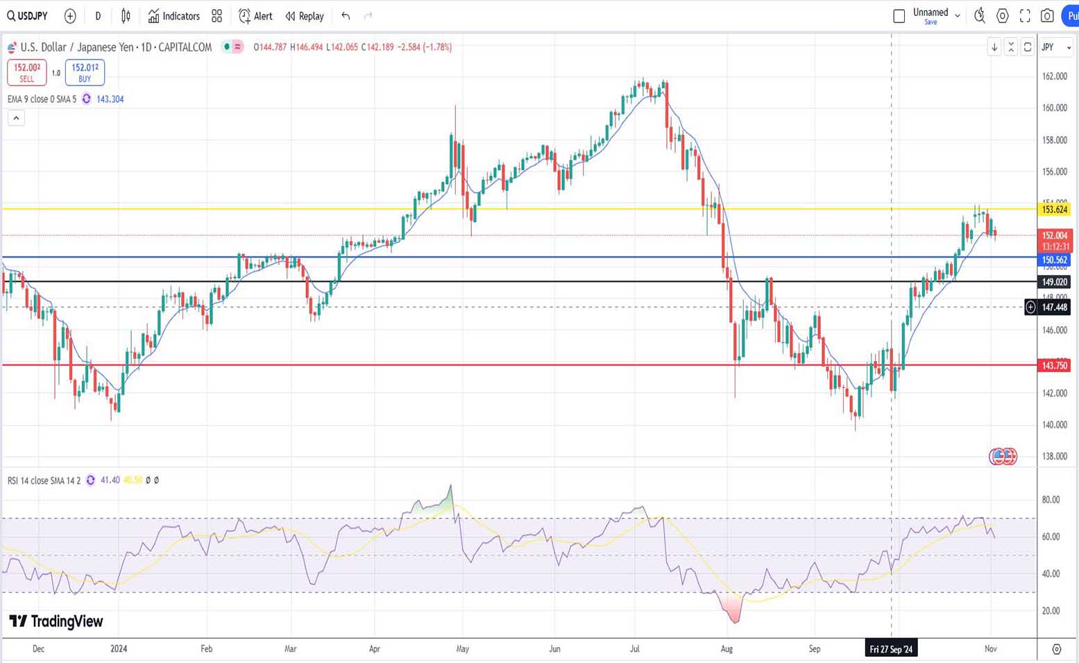 Η ισοτιμία αμερικανικού δολαρίου και γεν σήμερα, την τρέχουσα χρονική στιγμή [04/11/2024] είναι στα επίπεδα των 152 μονάδων.