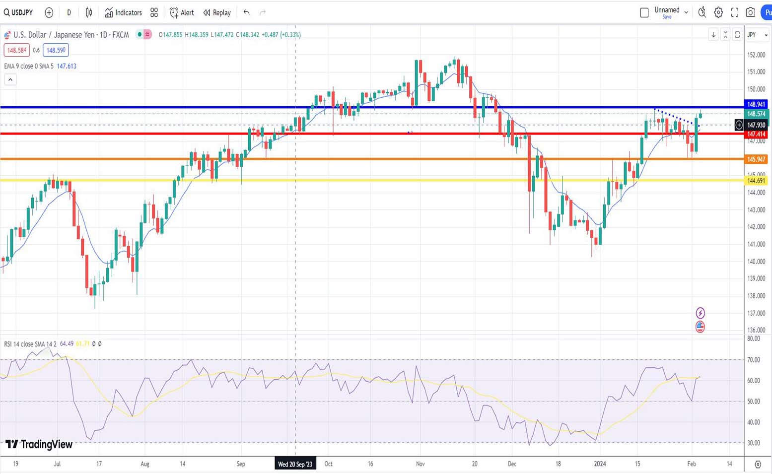 Σήμερα 05 Φεβρουαρίου 2024 βλέπουμε την ισοτιμία usd-jpy να επαναπροσεγγίζει την πλέον γνωστή για εμάς μπλε γραμμή αντίστασης, στο επίπεδο των 148,941 μονάδων. Αν γίνει αυτό το ανοδικό breakout, τότε ανοίγουν οι δρόμοι για τις 152 μονάδες…