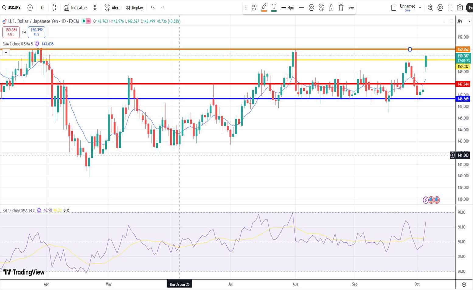 Το πρώτο σημείο που ξεχωρίζει είναι η κίνηση των τιμών γύρω από τον εκθετικό κινητό μέσο όρο (EMA) 9 ημερών. Για αρκετές εβδομάδες οι τιμές εναλλάσσονταν πάνω και κάτω από τον EMA, δείχνοντας μία αγορά δίχως καθαρή κατεύθυνση, όμως το τελευταίο ανοδικό ξέσπασμα έφερε καθαρή διάσπαση και κλείσιμο σημαντικά υψηλότερα, με έντονα πράσινα candlesticks που καταδεικνύουν αυξημένη αγοραστική πίεση. Η συνέχιση αυτής της τάσης θα εξαρτηθεί από το κατά πόσο η περιοχή των 147,94 (ισχυρή αντίσταση που φαίνεται να έγινε στήριξη) θα αντέξει σε τυχόν διορθώσεις.