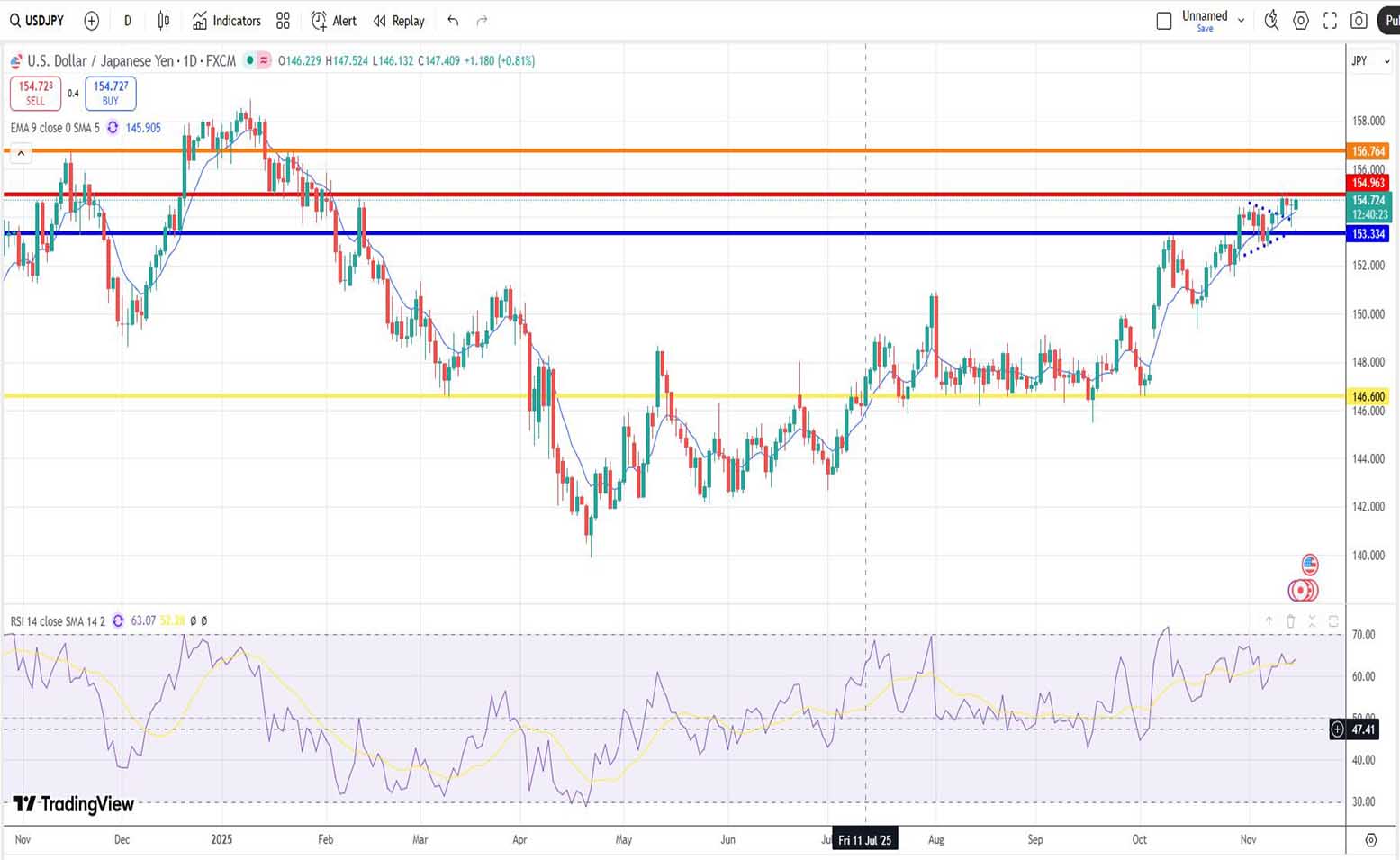 Το ζεύγος USDJPY συνεχίζει να κινείται σε έντονα ανοδική τροχιά, με την τιμή να δοκιμάζει για πολλαπλές ημέρες την περιοχή των 154.724, μια ζώνη αντίστασης που φαίνεται να έχει ιδιαίτερη σημασία για την αγορά. Το διάγραμμα δείχνει ότι η ανοδική τάση που ξεκίνησε από τα μέσα Σεπτεμβρίου παραμένει ζωντανή, καθώς η τιμή διατηρείται σταθερά πάνω από τον εκθετικό κινητό μέσο όρο 9 ημερών. Αυτή η ένδειξη φανερώνει ότι οι αγοραστές παραμένουν ενεργοί και πιέζουν σταθερά προς τα πάνω.