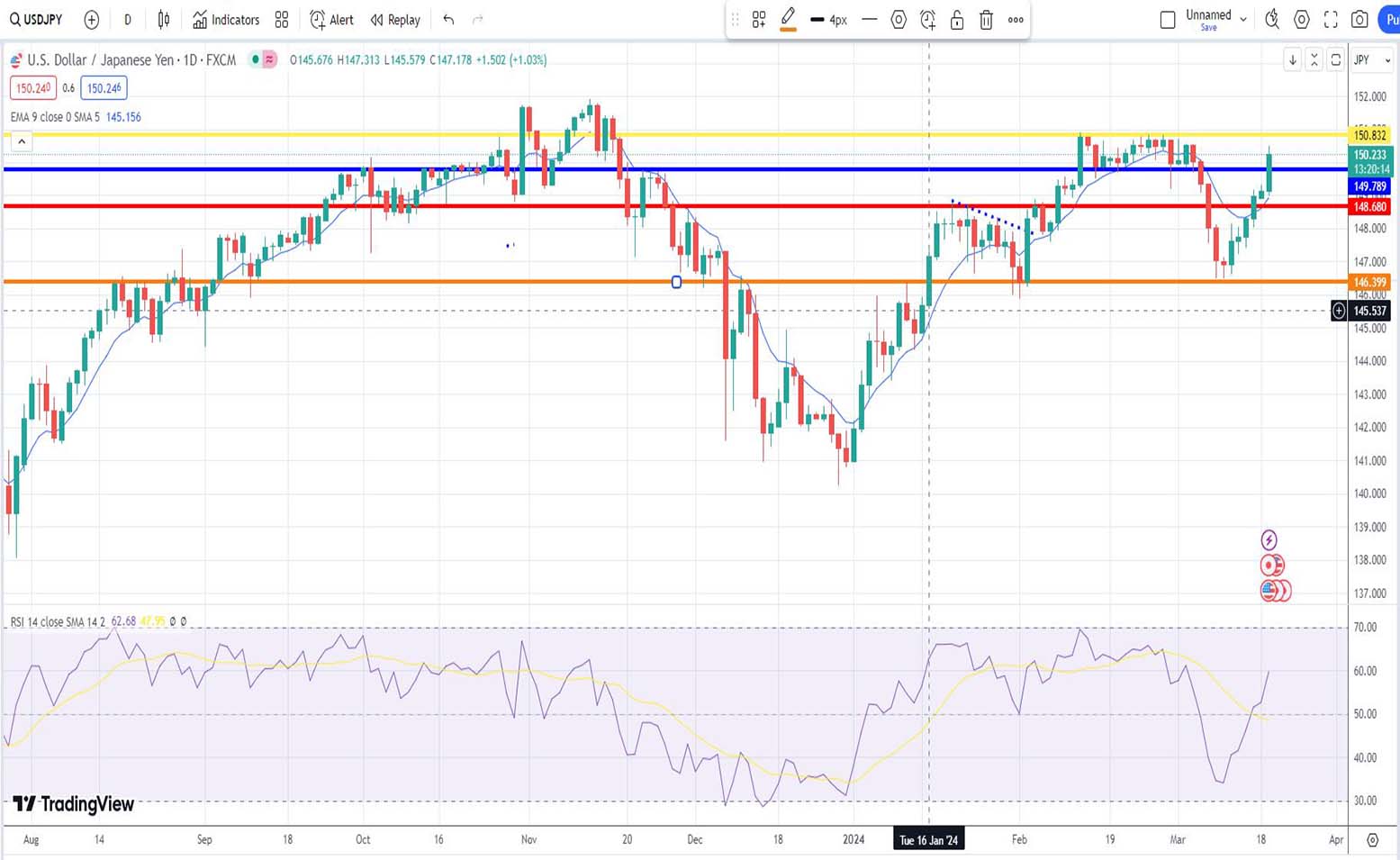 - Ανάλυση USD-JPY [Αμερικανικού δολαρίου έναντι Ιαπωνικού Γεν] για σήμερα 19/03/2024: