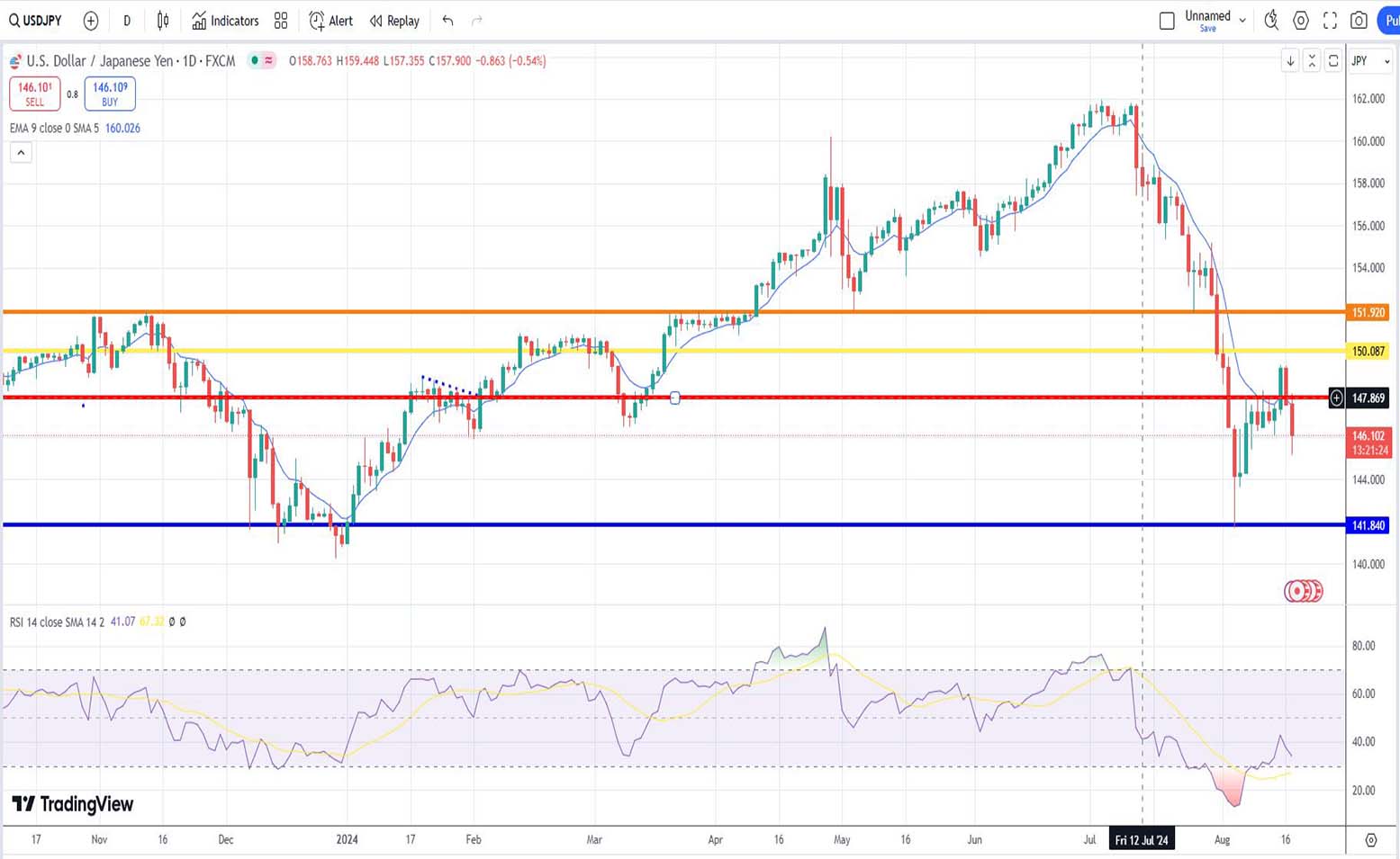 Η τεχνική ανάλυση της ισοτιμίας δολαρίου/γεν (USD/JPY) για την εβδομάδα που ξεκινά στις 19 Αυγούστου 2024, βασίζεται στις πρόσφατες διακυμάνσεις και τα τεχνικά σημεία που παρατηρήθηκαν στο διάγραμμα τιμής.