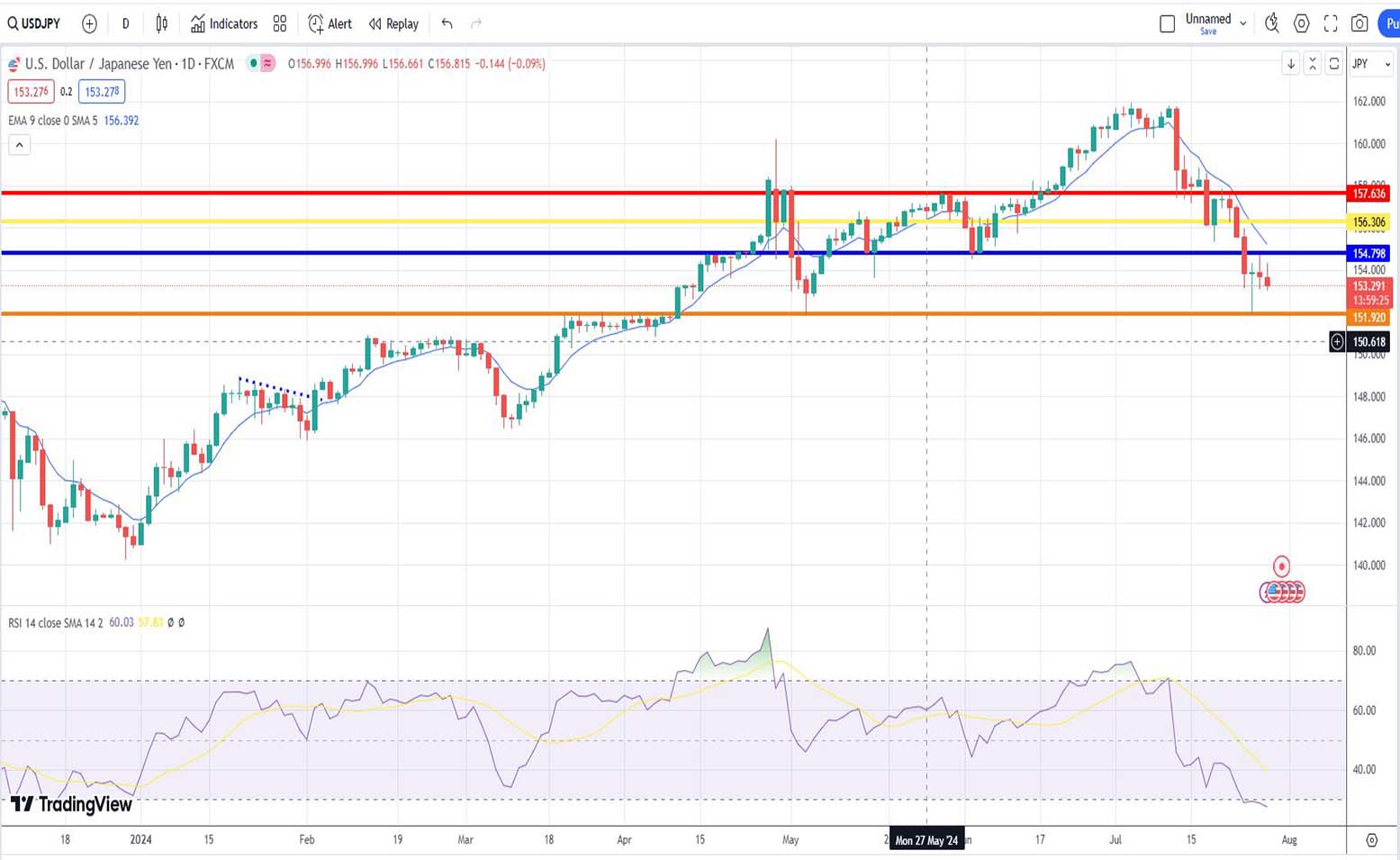 Πράγματι, η ισοτιμία USD/JPY παρουσίασε σημαντική πτωτική κίνηση, διασπώντας ακόμα και την μπλε οριζόντια γραμμή στήριξης στο επίπεδο των 154,798 μονάδων. Φτάνοντας να προσεγγίζει το αμέσως επόμενο επίπεδο στήριξης, οριζόμενο στην πορτοκαλί γραμμή, στο επίπεδο των 151,920 μονάδων.