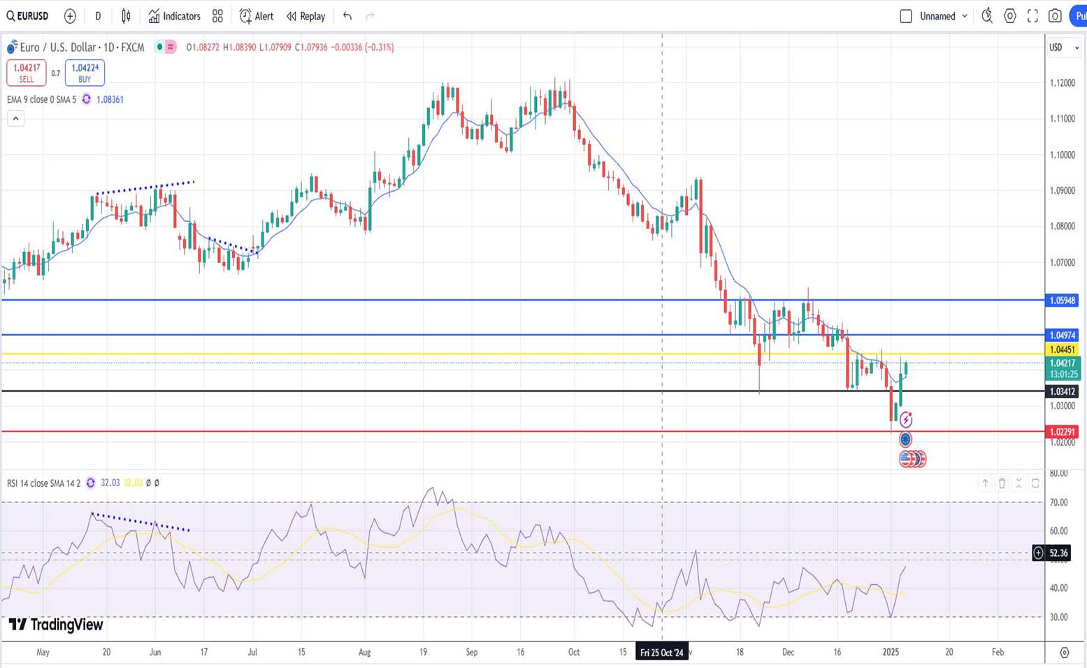 Στην ανάλυση της περασμένης εβδομάδας (με ημερομηνία αναφοράς 30 Δεκεμβρίου 2024), είχαμε προβλέψει την πτωτική πορεία της ισοτιμίας EUR/USD βάσει τεχνικής ανάλυσης.