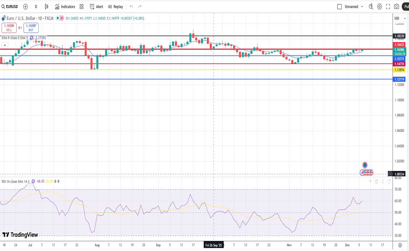Το EUR/USD παραμένει εγκλωβισμένο σε μια ευρεία πλάγια ζώνη εδώ και εβδομάδες, με την περιοχή 1.1571–1.1473 να λειτουργεί επαναλαμβανόμενα ως ισχυρή βάση στήριξης. Ταυτόχρονα, η τιμή προσπαθεί να πλησιάσει την αντίσταση των 1.1658, δείχνοντας μια ήπια ανοδική διάθεση.