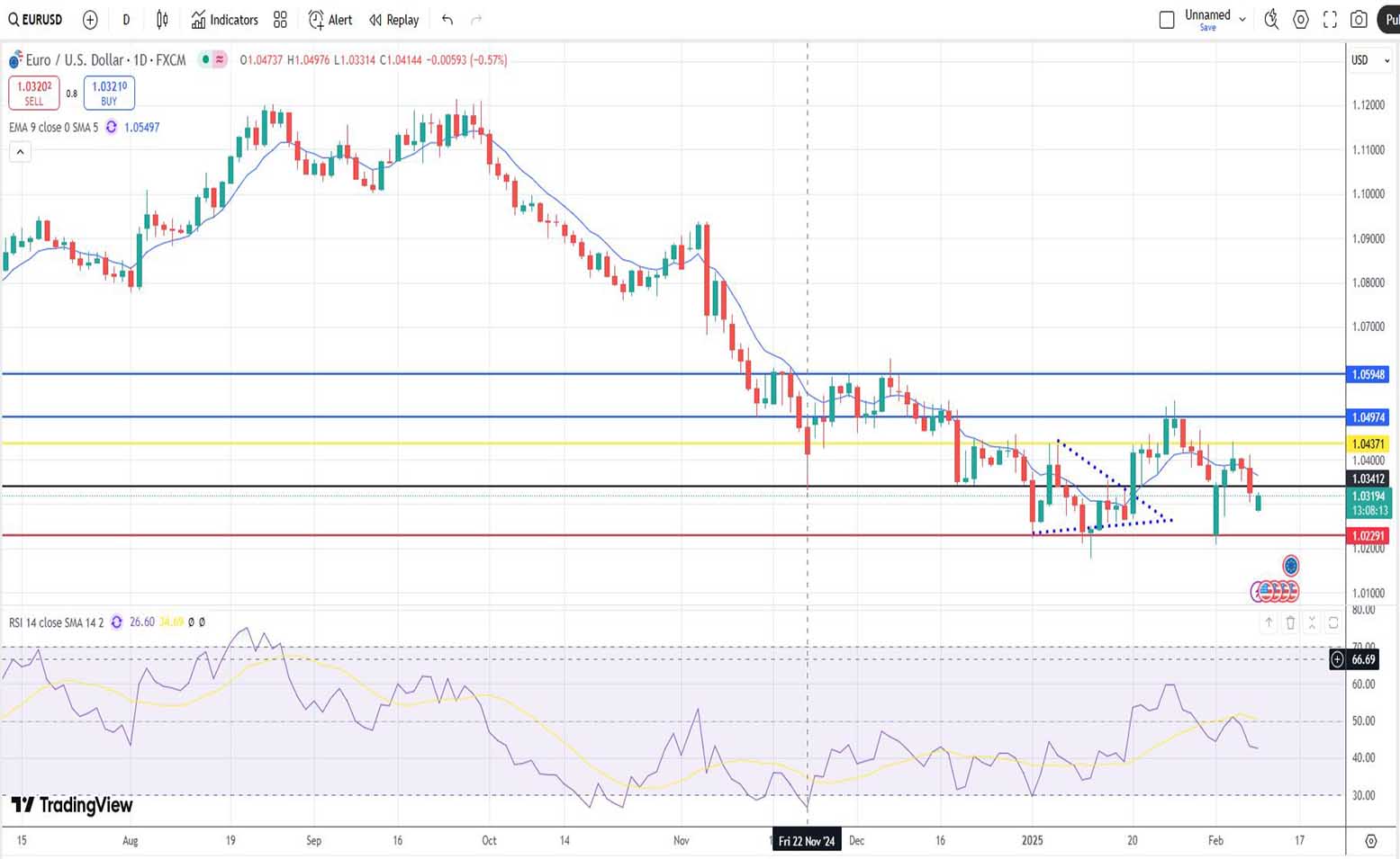 Στην προσπάθειά μας να προβλέψουμε την ισοτιμία ευρώ-δολαρίου με βάση την τεχνική ανάλυση, την περασμένη εβδομάδα, με ημερομηνία αναφοράς την 3η Φεβρουαρίου 2025, παρατηρούμε πόσο δύσκολο έχει γίνει πλέον να κάνουμε ακριβείς και αξιόπιστες προβλέψεις για την πορεία της ισοτιμίας EUR/USD, κυρίως λόγω της εκλογής Τραμπ και των δασμών που έχει επιβάλει. Αυτό έχει δημιουργήσει τρομερη μεταβλητότητα στις αγορές κεφαλαίου και χρήματος παγκοσμίως!
