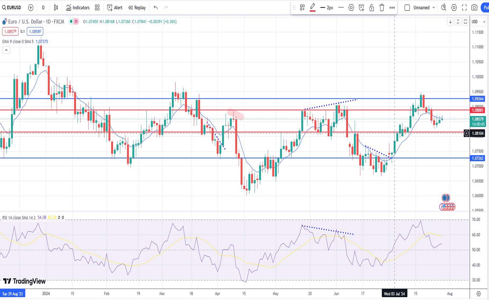 Εκτιμούμε, όπως προείπαμε και την περασμένη εβδομάδα (17/07/2024), ότι θα έχουμε έντονη πτωτική κίνηση μέχρι την κόκκινη οριζόντια γραμμή στήριξης, στο επίπεδο των 1,08143 μονάδων.”