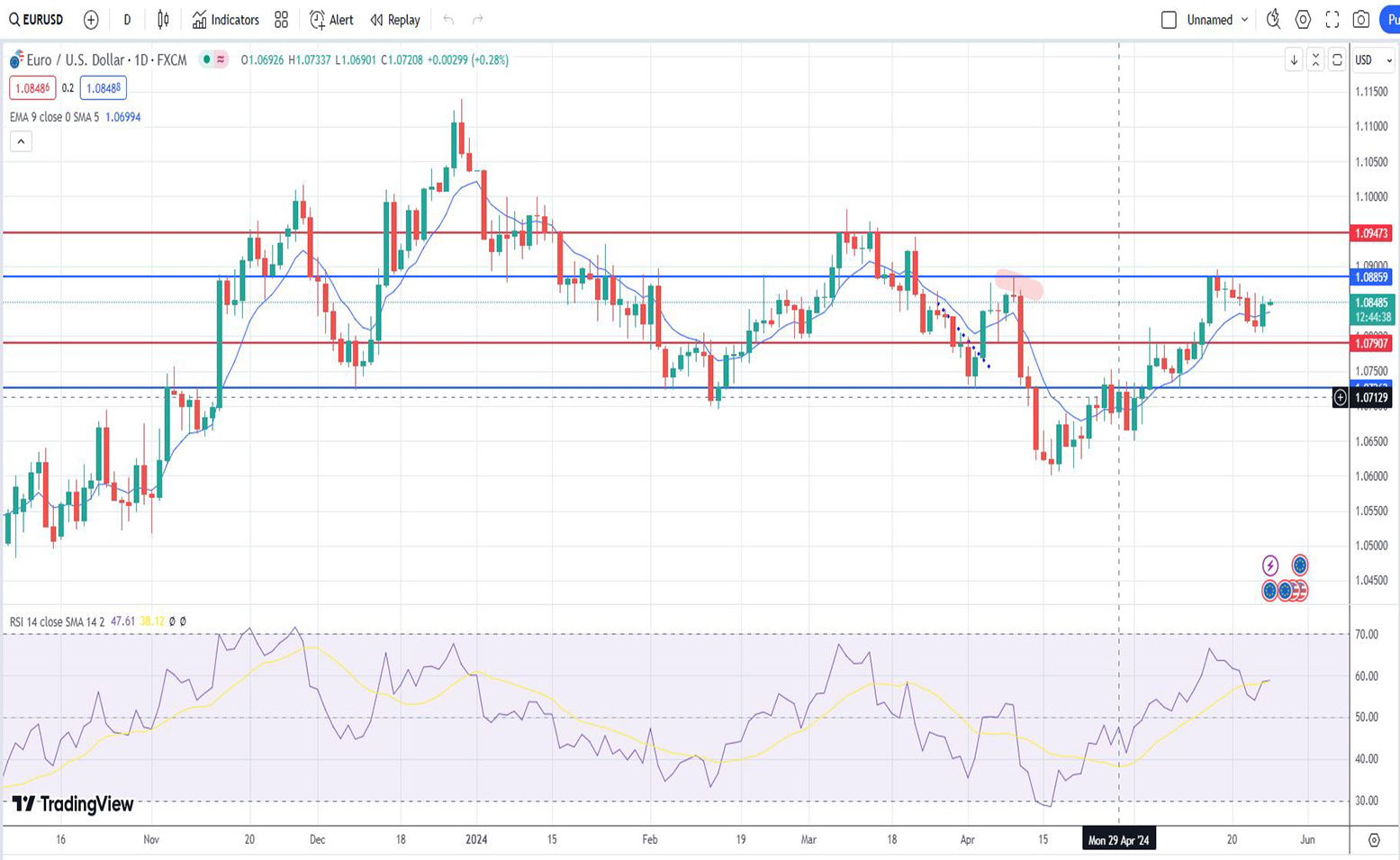 Η ισοτιμία ευρω δολάριο όπως προείπαμε και την περασμένη εβδομάδα 20/05/2024, έκανε τη διόρθωση της από το επίπεδο της μπλε αντίστασης του 1,08859 προς το 1,07907, χωρίς βέβαια να το αγγίξει.