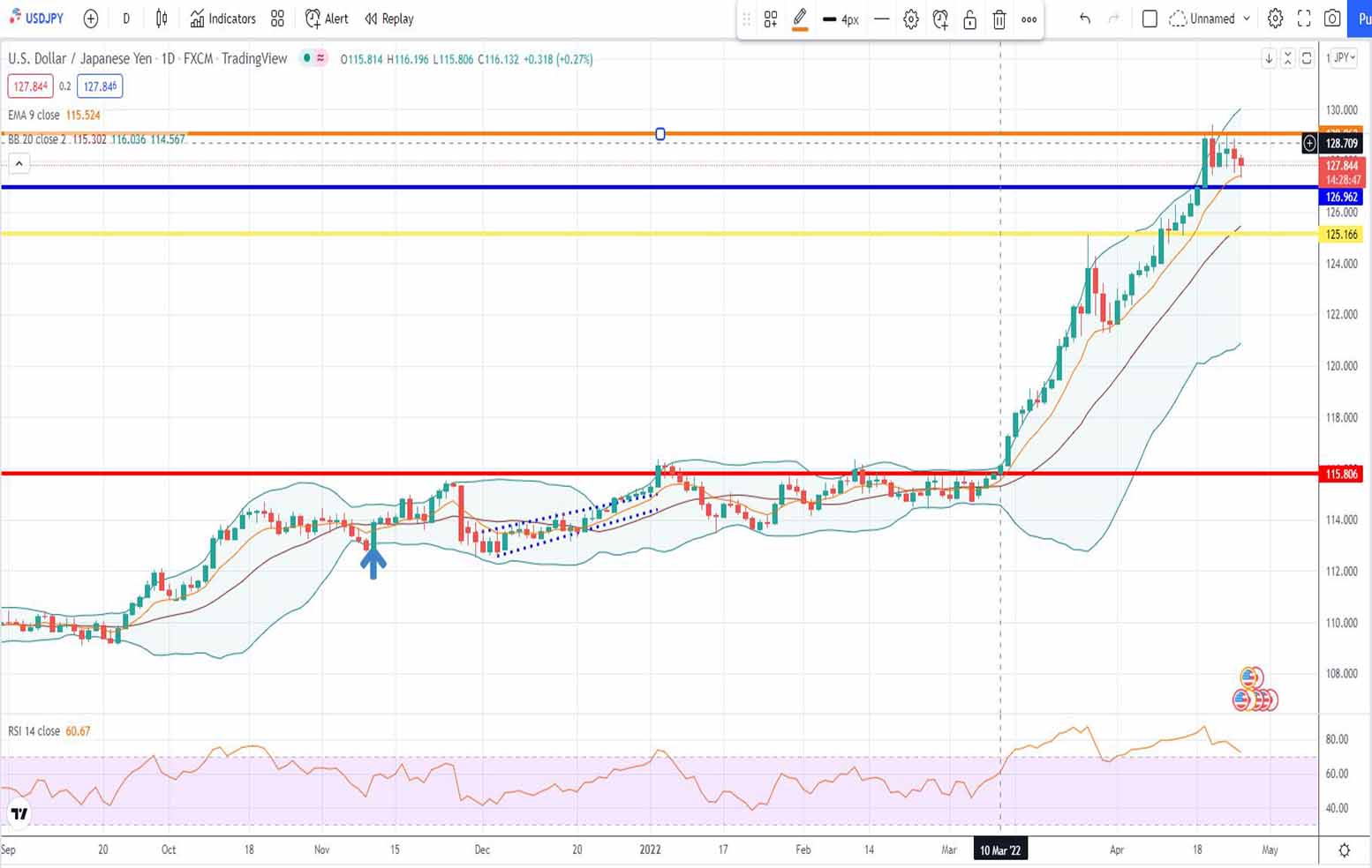 Στην τεχνική ανάλυση της ισοτιμίας δολαρίου-γεν με ημερομηνία αναφοράς 18 Απριλίου 2022 είχαμε γράψει τα κάτωθι:
