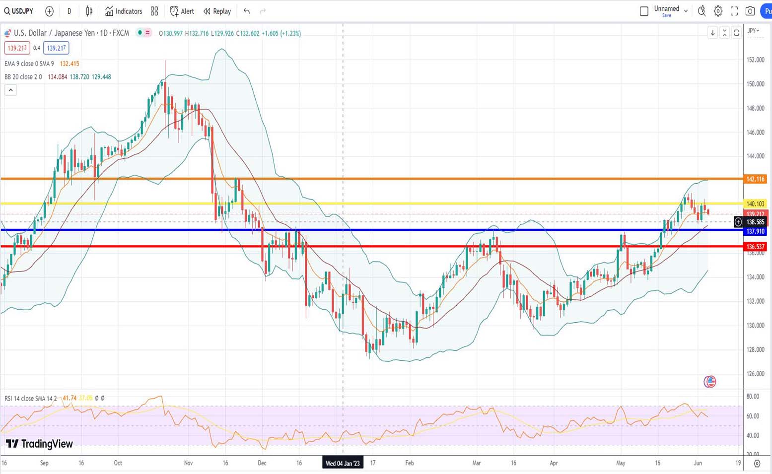 Αυτός είναι και ο λόγος που σήμερα 06/06/2023 ανοίγουμε short θέσεις για να εκμεταλλευτούμε πιθανή πτωτική κίνηση της ισοτιμίας usd/jpy. Σε πρώτη φάση μέχρι την μπλε οριζόντια γραμμή στήριξης των 137,910 μονάδων.