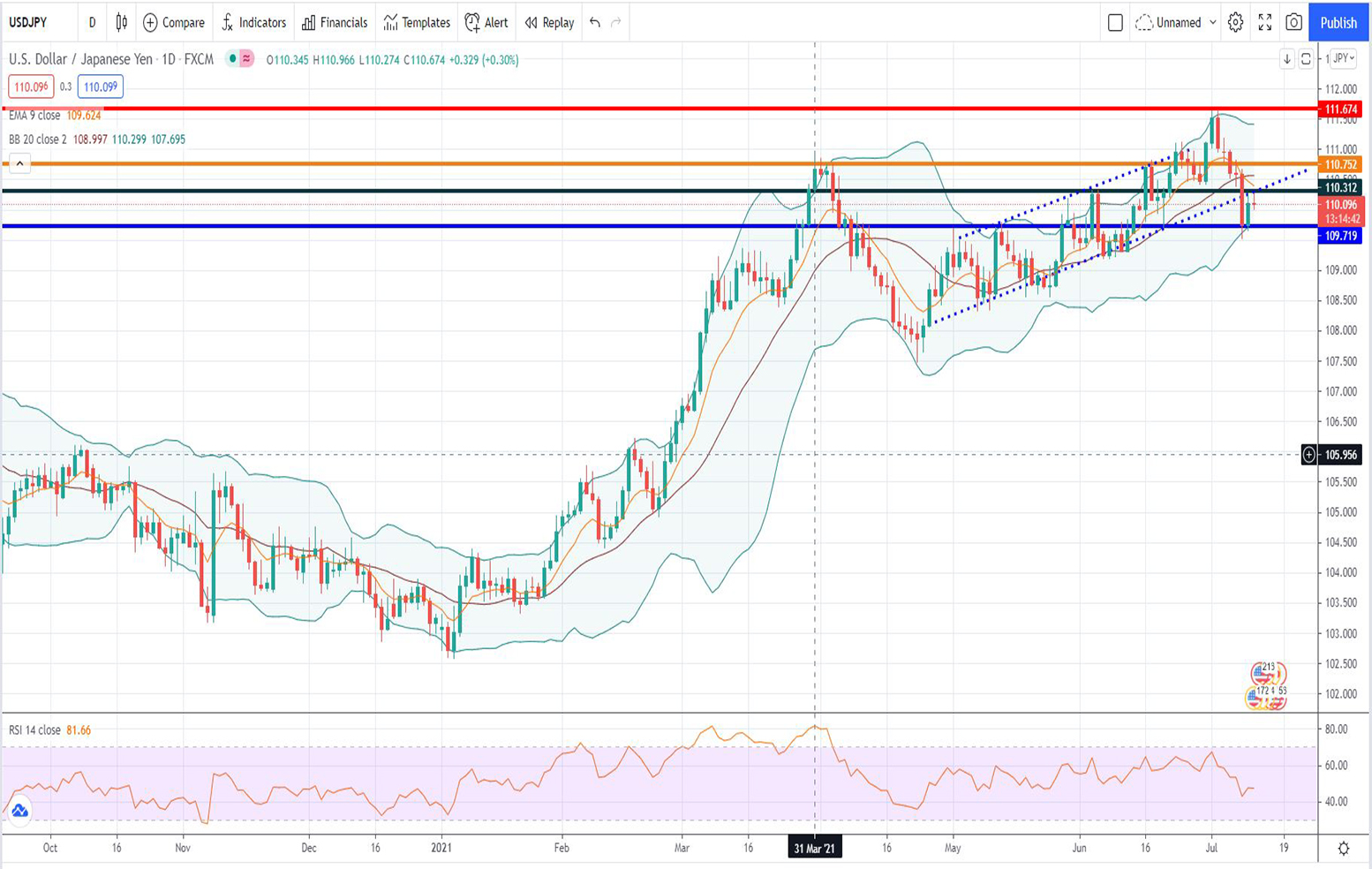 Αυτό βέβαια είχε ως αποτέλεσμα την επιβεβαίωση της δεύτερης στήριξης. Όπως την έχουμε ορίσει με την μπλε οριζόντια γραμμή στο 109,719. Ευτυχώς αυτή κράτησε την ισοτιμία usd/jpy. Δίνοντας μάλιστα και ένα ανοδικό candlestick, για να βρεθεί σήμερα 12 Ιουλίου 2021 η ισοτιμία usdjpy στο επίπεδο των 110,096.