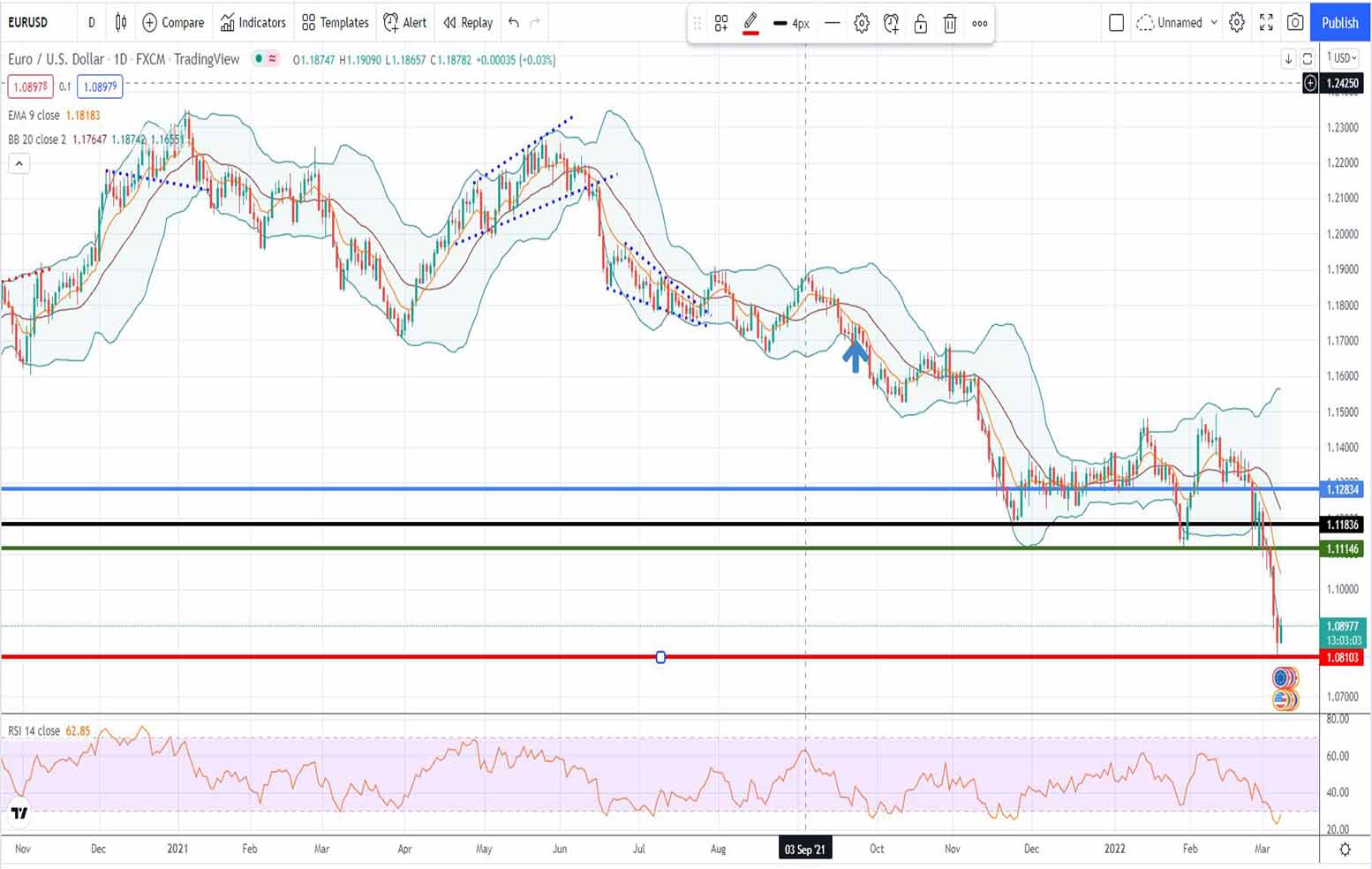 Στην περίπτωσή μας, για την ισοτιμία Euro/USD, στην ραγδαία αλλαγή αυτής της τάσης σαφώς και συμβάλλει ο πόλεμος που γίνεται κατά της Ουκρανίας. Αυτό δημιουργεί περισσότερο αναταραχές σε όλα τα χρηματοπιστωτικά μέσα.
