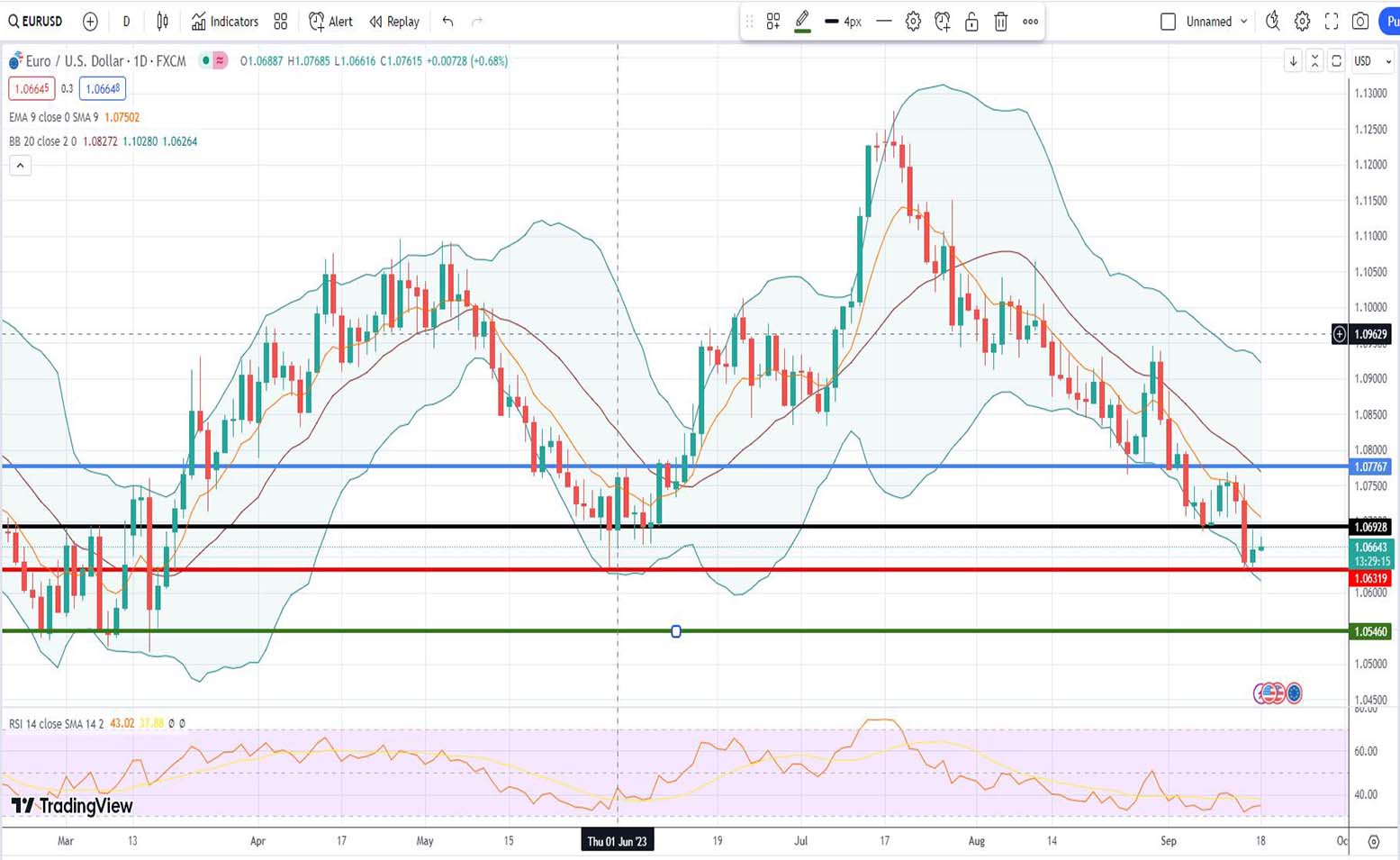 Σήμερα 18/09/2023, βλέπουμε την ισοτιμία να βρίσκει στήριξη στο 1.06319. Έτσι όπως και την έχουμε ορίσει με την κόκκινη οριζόντια γραμμή, στο διάγραμμα τιμής της ισοτιμίας Eur/USD.