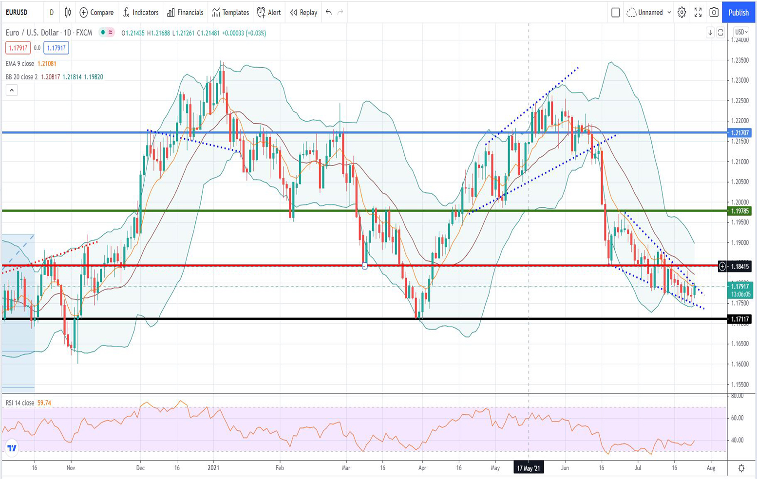 Η τεχνική ανάλυση της ισοτιμίας ευρώ-δολαρίου όπως είχαμε πει και στην προηγούμενη ανάλυση μας [20/07/2021], συνεχίζει να παραμένει εγκλωβισμένη, μεταξύ των δύο διακεκομμένων μπλε γραμμών. Που μάλλον δείχνουν να σχηματίζουν καθοδική σφήνα.