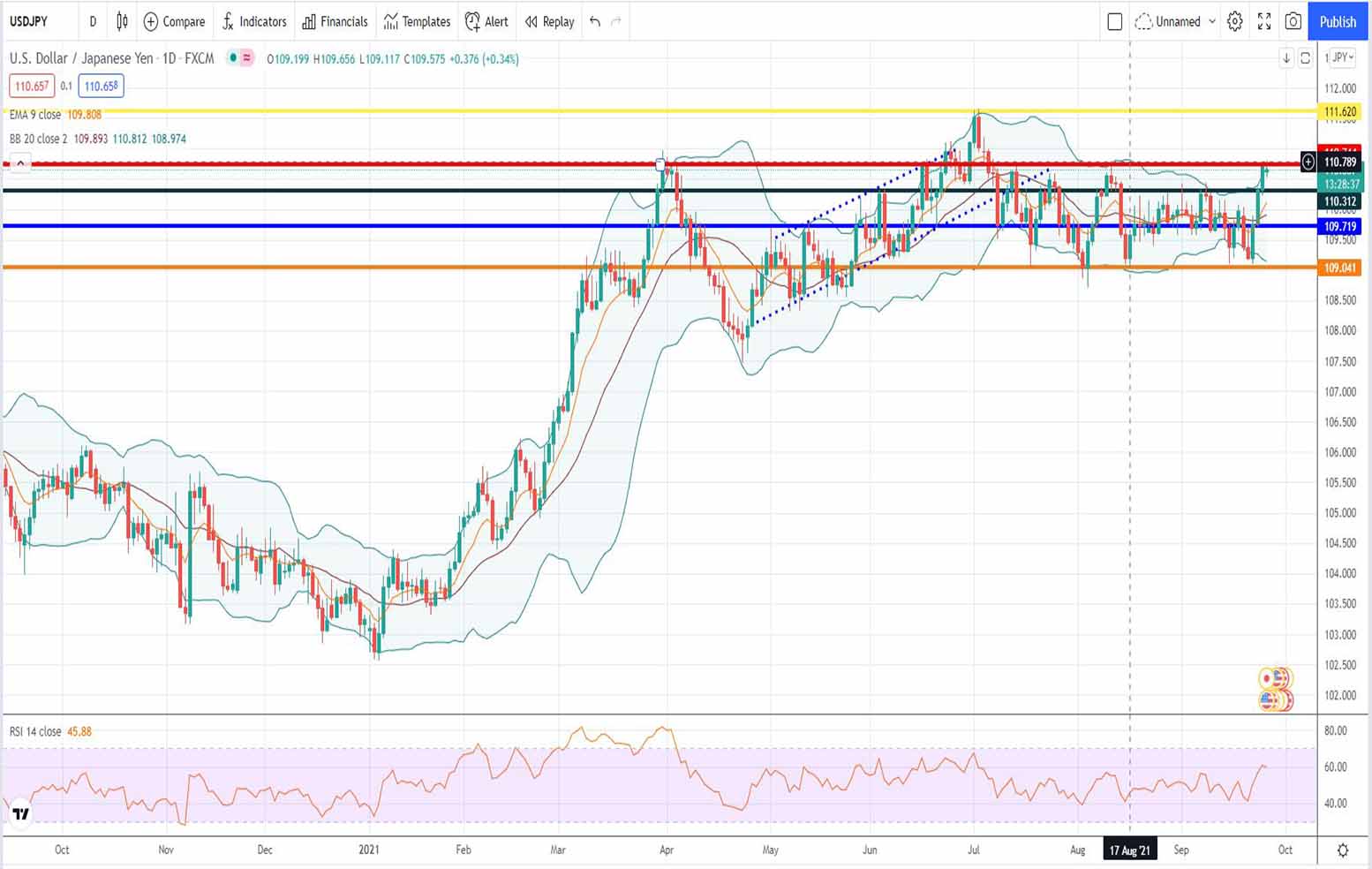 Η πορεία της ισοτιμίας δολαρίου έναντι του ιαπωνικού γεν την περασμένη εβδομάδα 20/09/2021, μας έδειξε την εγκυρότητα της γραμμής στήριξης, την οποία εκ νέου τέσταρε το δολάριο έναντι του ιαπωνικού γεν. Αυτό είναι το επίπεδό τον 109.041 μονάδων στο διάγραμμα τιμής της ισοτιμίας usd/jpy [πορτοκαλί οριζόντια γραμμή στήριξης].