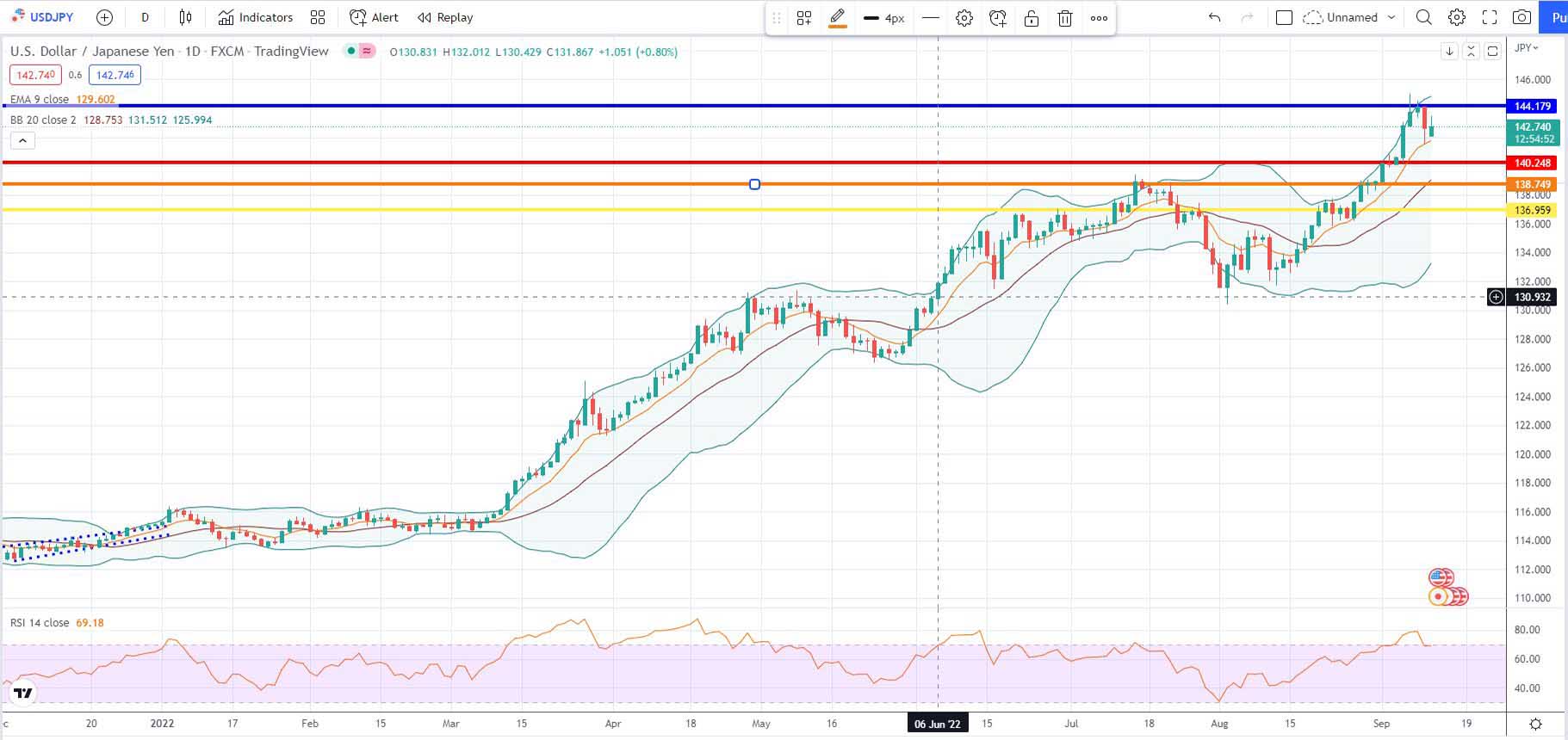 Συνεχώς ως στρατηγική μας θα είναι να “ανοίξουμε εκ νέου short θέσεις” στην ισοτιμία usdjpy, αλλά σε πιο υψηλές τιμές, για αναμενόμενη διόρθωση του δολαρίου έναντι του γεν, τουλάχιστον μέχρι το επίπεδο των 140,248 μονάδων.