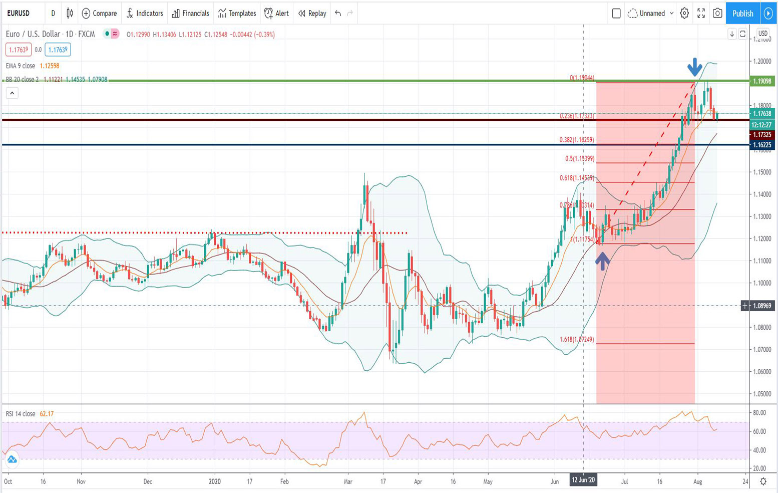 Η τεχνική ανάλυση της ισοτιμίας ευρώ-δολάριο την περασμένη εβδομάδα [05-08-2020], μας έδειξε την έντονα δυναμική ανοδική τάση, που είχε αναπτύξει το ευρώ, έναντι του αμερικανικού δολαρίου. Συγκεκριμένα, είχαμε γράψει: