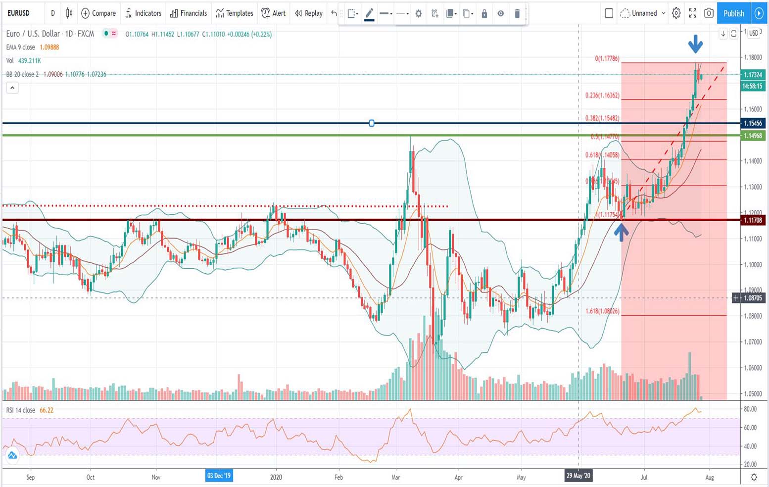 Όπως μπορεί να δει κανείς από την τεχνική ανάλυση της ισοτιμίας Euro-USD, η άνοδος που έκανε το ευρώ ήταν απλά εκπληκτική. Εν μέρει, το είχαμε προβλέψει στην τεχνική ανάλυση της περασμένης εβδομάδας με ημερομηνία 22 Ιουλίου 2020. (Βέβαια είμασταν πιο συντηρητικοί στην πρόβλεψη για ευνόητους λόγους).
