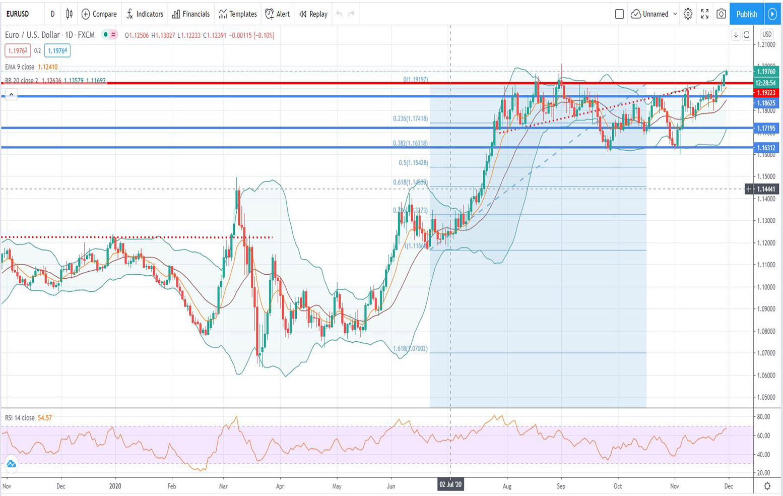 Η τεχνική ανάλυση-πρόβλεψη της ισοτιμίας ευρώ-δολαρίου την περασμένη εβδομάδα [23/11/2020] μας έδειξε πολύ όμορφα, την ανοδική τάση που πράγματι ακολούθησε το ευρώ σε σχέση με το δολάριο. Είχαμε μάλιστα ορίσει ως τιμή-στόχο τα 1,19223. Αν ανατρέξει κανείς την περασμένη εβδομάδα και διαβάσει το άρθρο θα καταλάβει τι εννοούμε…