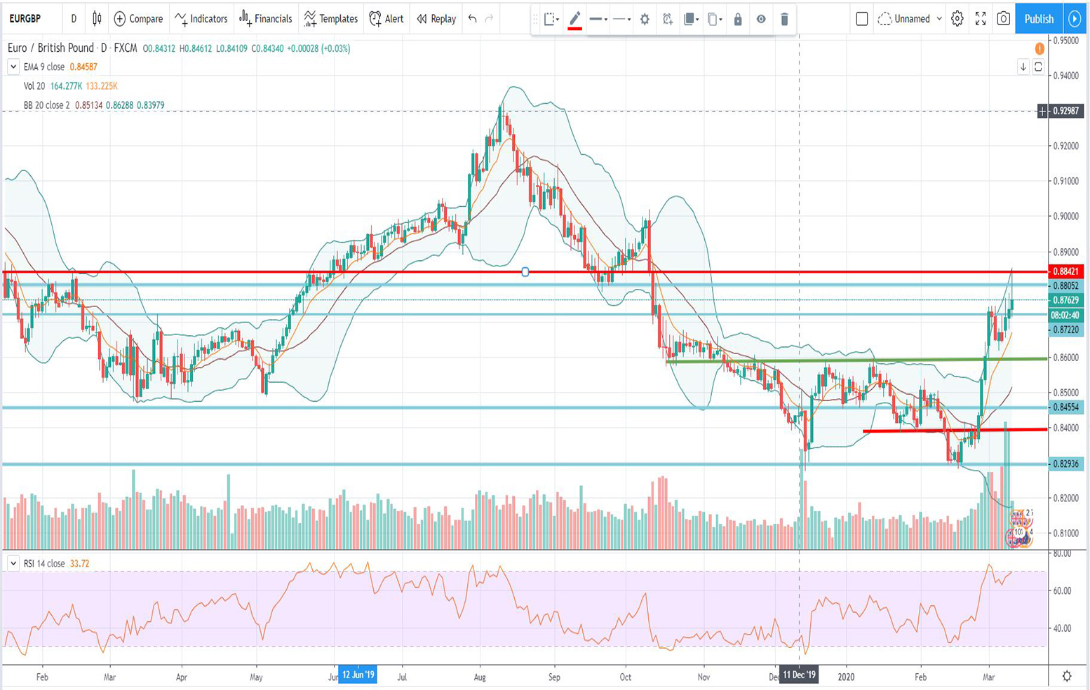 H τεχνική ανάλυση του ευρώ σε σχέση με την αγγλική λίρα με ημερομηνία 11/03/2020 δείχνει: