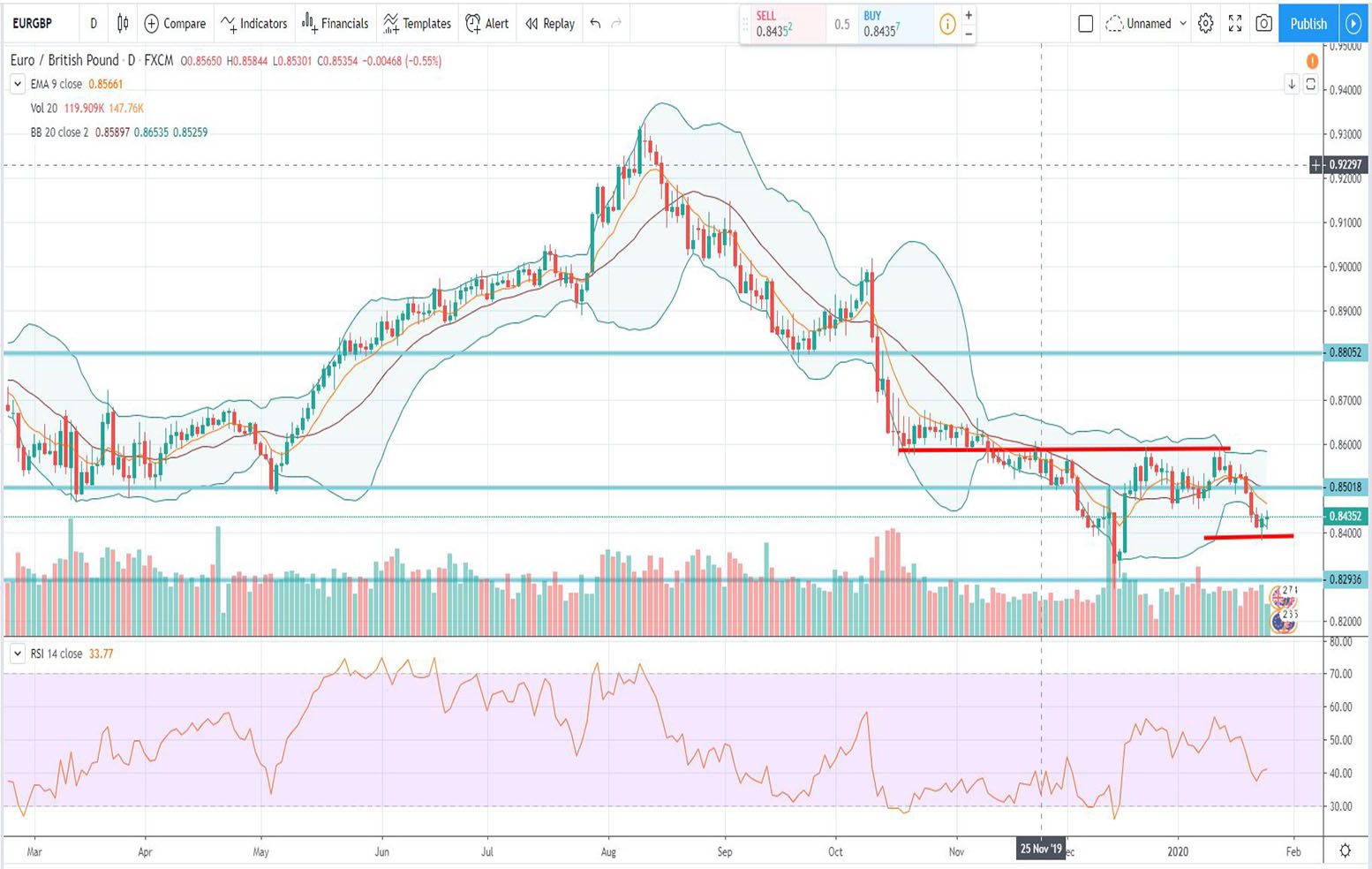 H τεχνική ανάλυση του ευρώ σε σχέση με την αγγλική λίρα με ημερομηνία 27/01/2020 δείχνει ότι:
