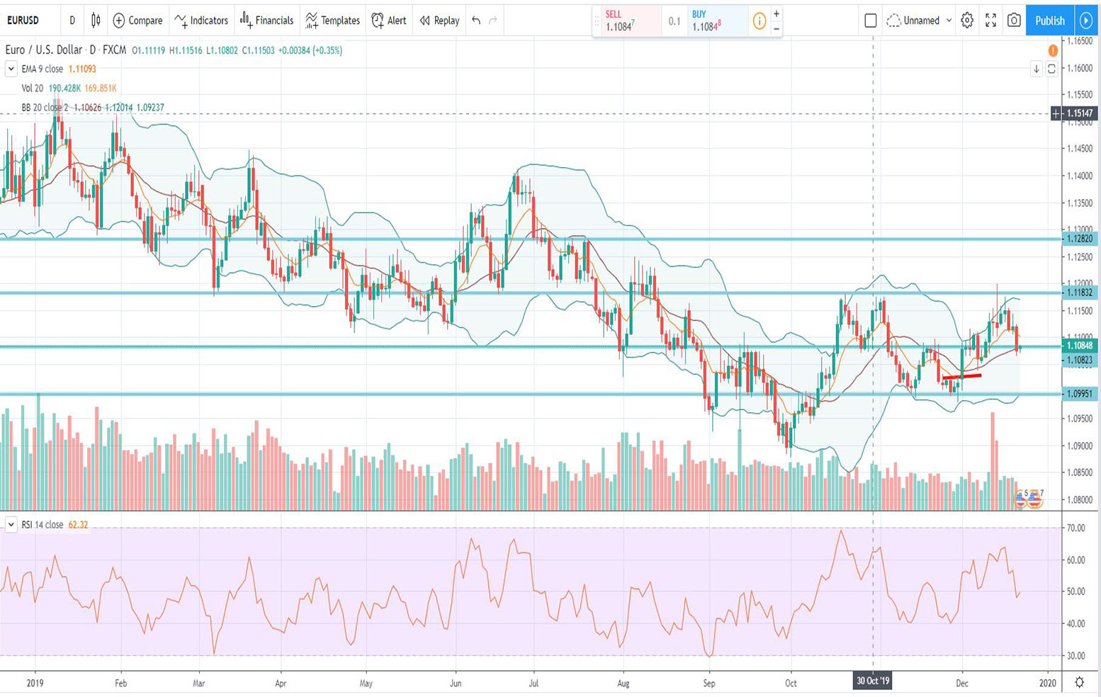 Η τεχνική ανάλυση ευρώ δολαρίου με ημερομηνία 23/12/2019 μας δείχνει ότι: