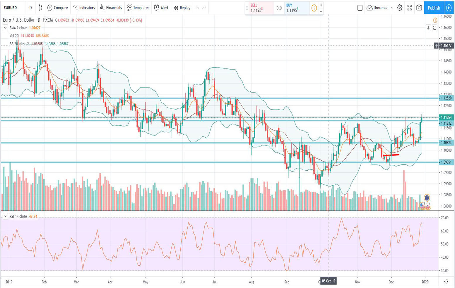 Η τεχνική ανάλυση ευρώ δολαρίου με ημερομηνία 30/12/2019 μας δείχνει ότι: