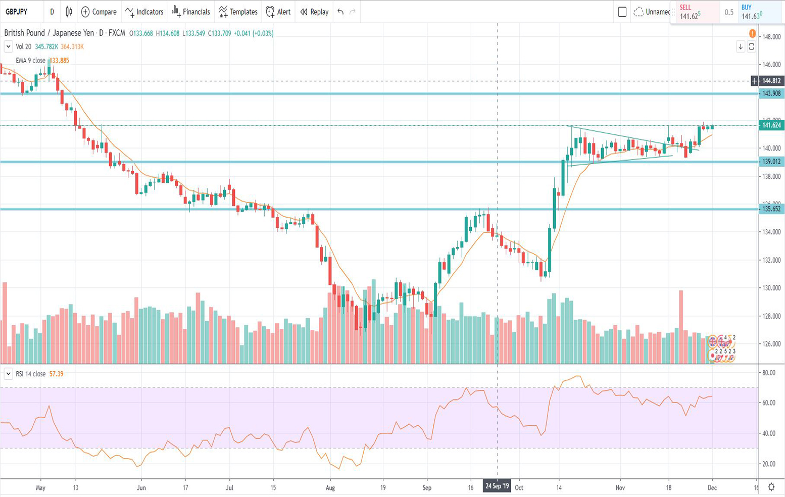 Σε αυτή τη φάση που γράφουμε (ημερομηνία ανάλυσης 02 Δεκεμβρίου 2019) η τεχνική ανάλυση για την ισοτιμία μεταξύ της Αγγλικής Λίρας και του ιαπωνικού γεν (GBP-JPY) δείχνει ότι: