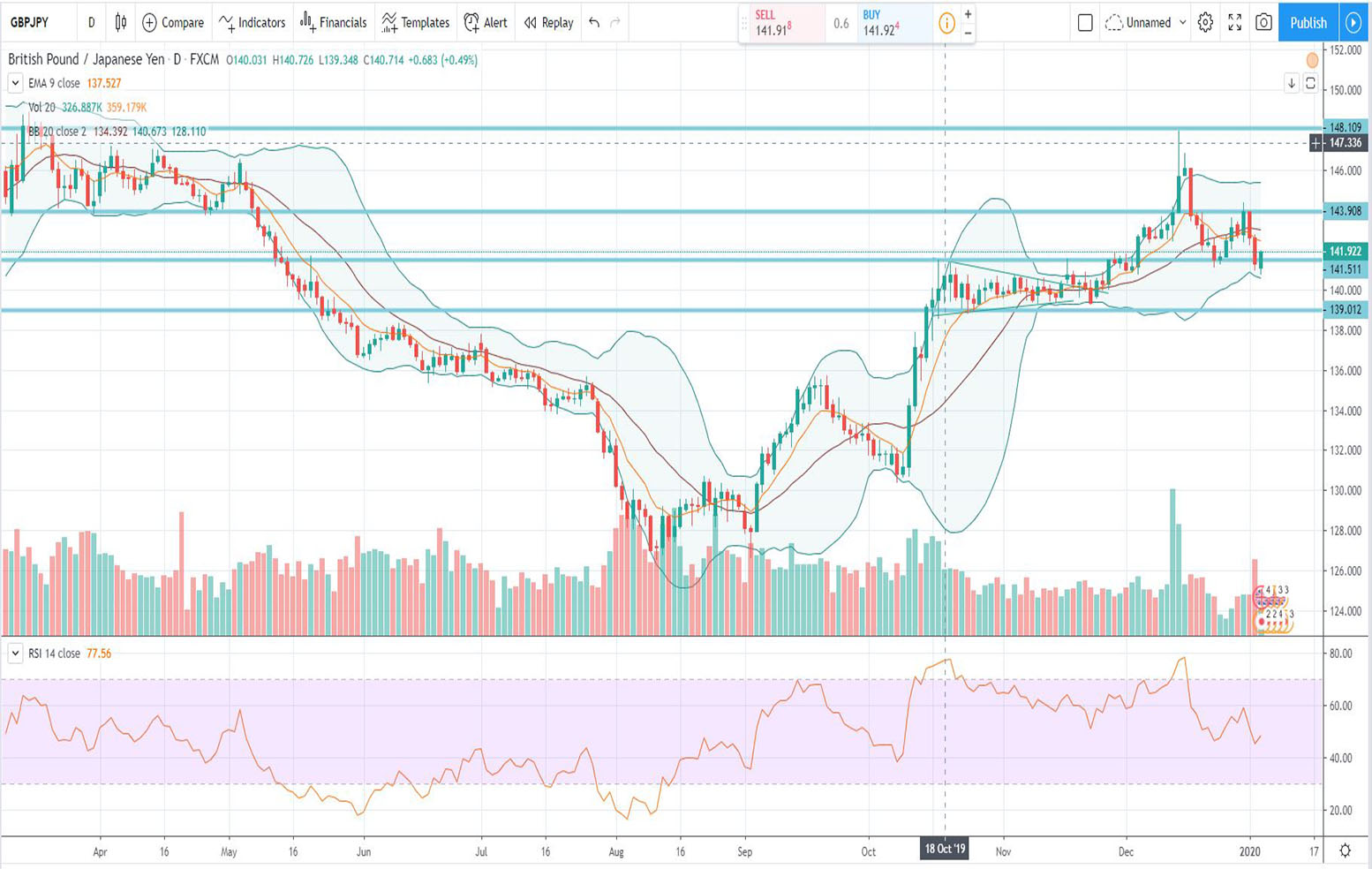 Όμως ο ΚΜΟ(9) είναι πτωτικός όπως και ο ΚΜΟ των Bollinger Bands…με τοπικό υψηλό και από τον RSI(14) στα επίπεδα των 60 μονάδων…Ιδιαίτερα bearish σήματα για την ισοτιμία GBP-JPY την 06-01-2020. Και ένα πτωτικό breakout σε αυτά τα επίπεδα είναι ικανό να δώσει πτώση για την λίρα αγγλίας μέχρι και τα επίπεδα των 139 μονάδων (Συνδυασμός Διπλής κορυφής με πτωτικό BREAKOUT)
