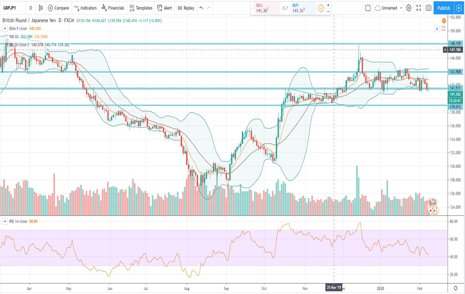 Στο διάγραμμα της τεχνικής ανάλυσης για την ισοτιμία GBP-JPY με ημερομηνία 10/02/2020 βλέπουμε ότι: