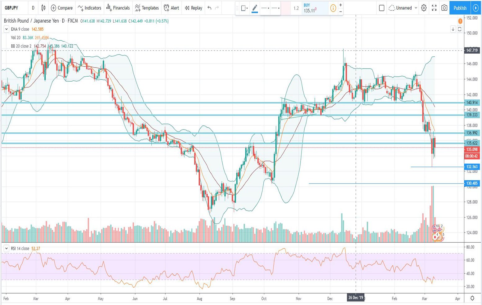 Στο διάγραμμα της τεχνικής ανάλυσης για την ισοτιμία GBP-JPY με ημερομηνία 11/03/2020 βλέπουμε ότι:
