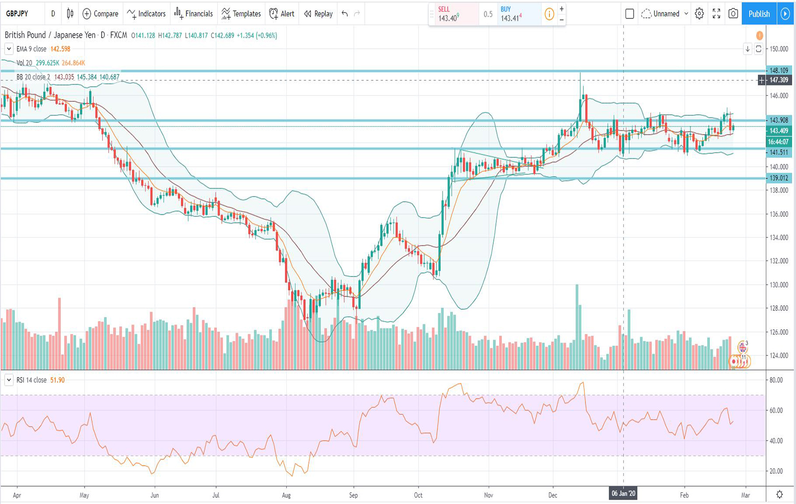 Στην προηγούμενη ανάλυση [17/02/2020] για την αγγλική λίρα σε σχέση με το Ιαπωνικό γιεν, το 143,91 είπαμε ότι θεωρείται ισχυρότατο σημείο αντιστάσης για την εξεταζόμενη ισοτιμία.