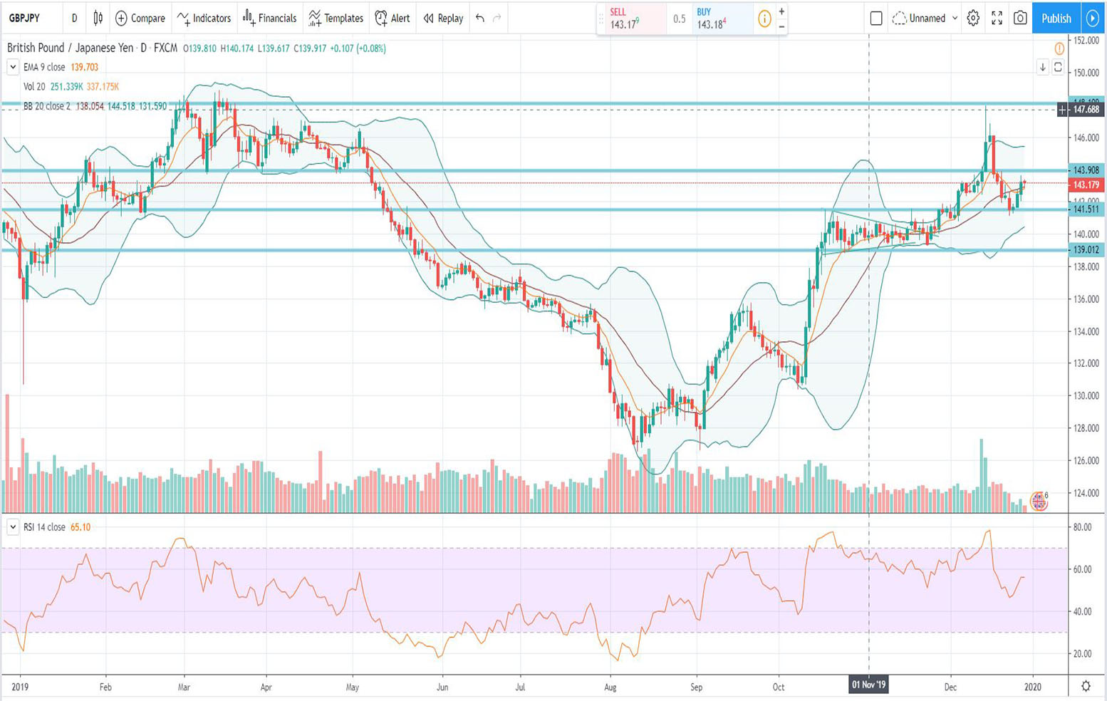 Στο διάγραμμα της τεχνικής ανάλυσης για την ισοτιμία GBP-JPY με ημερομηνία 23/12/2019 είχαμε εστιάσει στην ύπαρξη σημαντικής στήριξης, η οποία τελικά κράτησε την ισοτιμία της λίρας Αγγλίας σε σχέση με το Ιαπωνικό γεν στο 141,511.