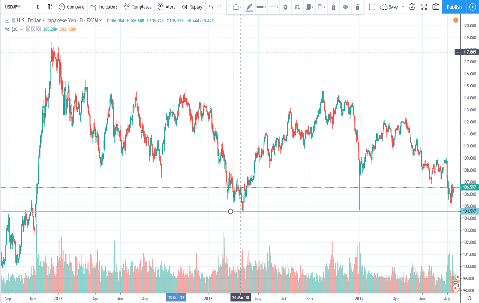 Σήμερα 19/08/2019 έχουμε μια ανοδική κίνηση υπέρ βραχυχρόνιου τύπου στο 106,5.